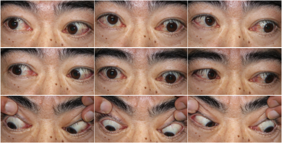正面、上下左右、斜めの9方向を見たときに、左右の眼の位置のずれや複視の症状がないかを確認します。
